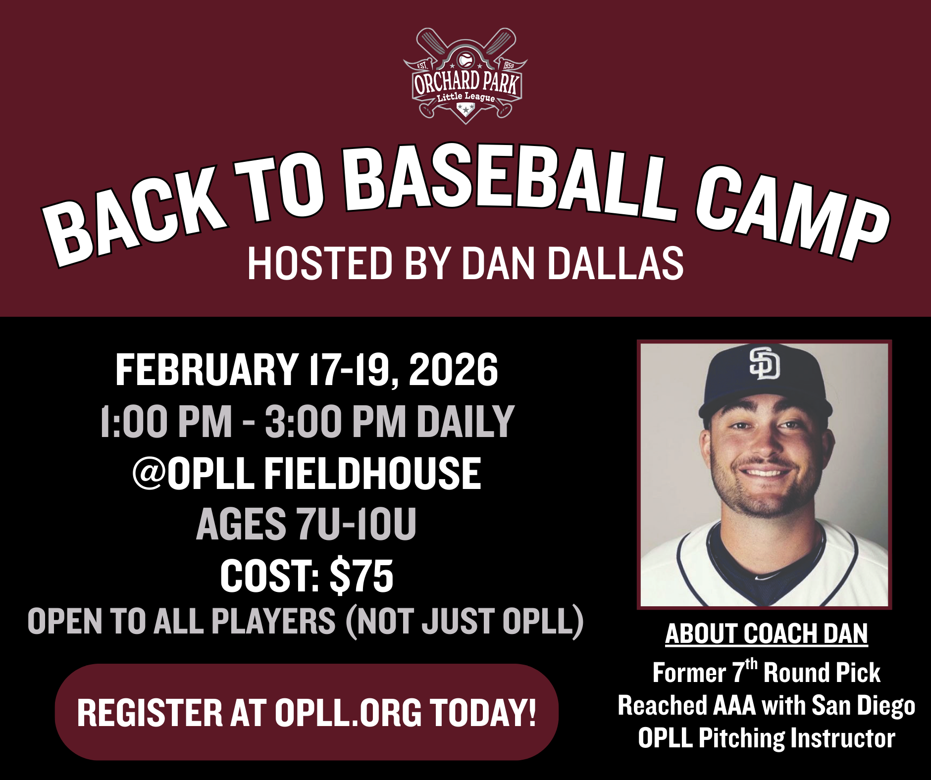 Our Back to Baseball Camp runs February 17–19, 2026 (1:00–3:00 PM daily) at the OPLL Fieldhouse and is open to players ages 7–10 of all skill levels. Instruction will be led by Coach Dan Dallas, a former 7th-round MLB Draft pick who reached Triple-A with the San Diego Padres and currently serves as an OPLL Pitching Instructor. Players will focus on fundamentals, skill development, and confidence-building in a structured indoor setting.
